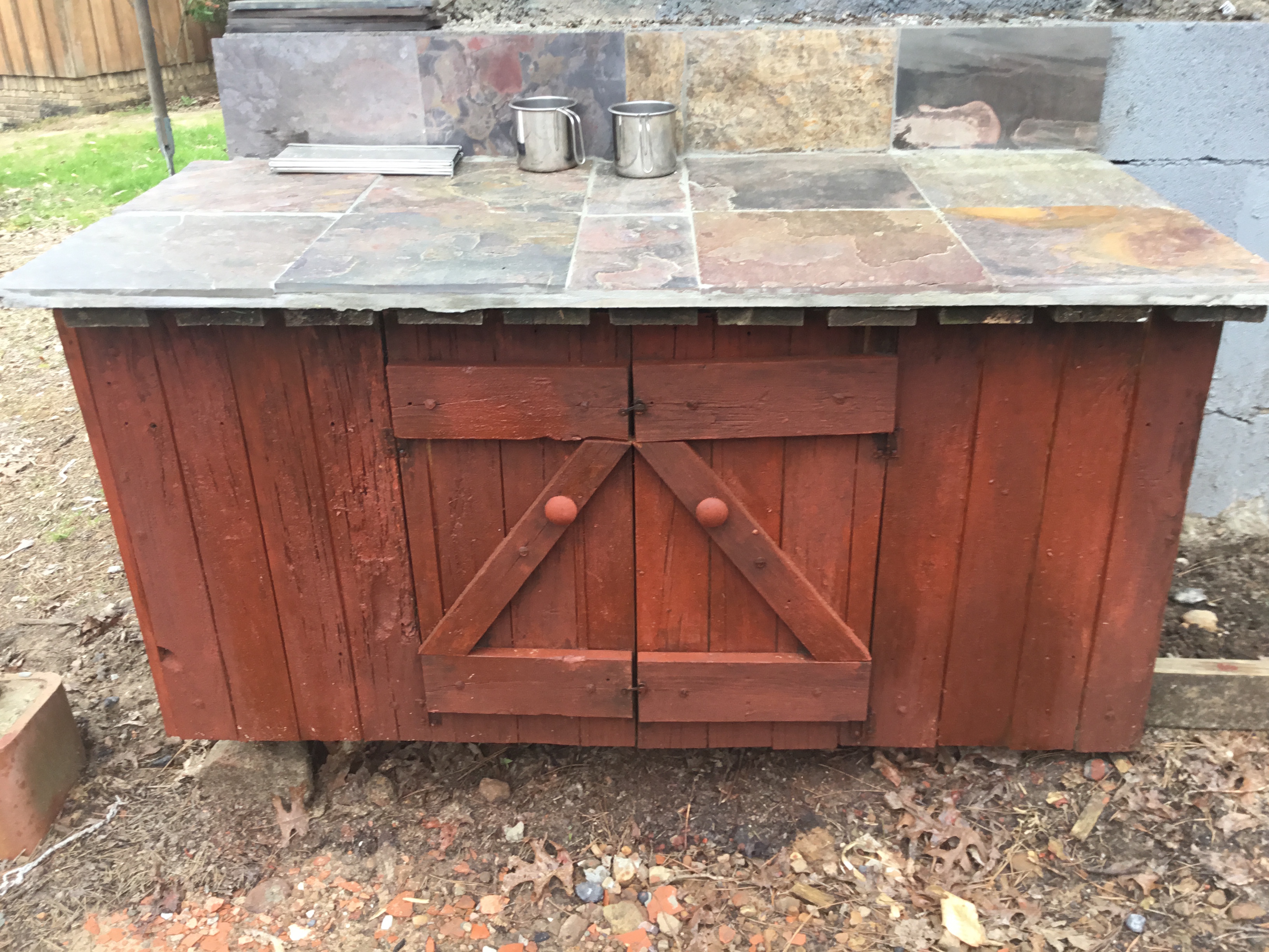 This cabinet is attached to the back of my brick oven, as there is never enough room to store the gear that accumulates over the years. It’s actually only an old greenhouse bench which I clad in old PT boards into which I cut tongue and groove joints. I also made the paint, which I will discuss later, as some people actually cook this paint, and the top is–drumroll–fireproof! That’s cement board topped with un-gauged slate. The next project is a “Tuscan” grill to be built next to it.