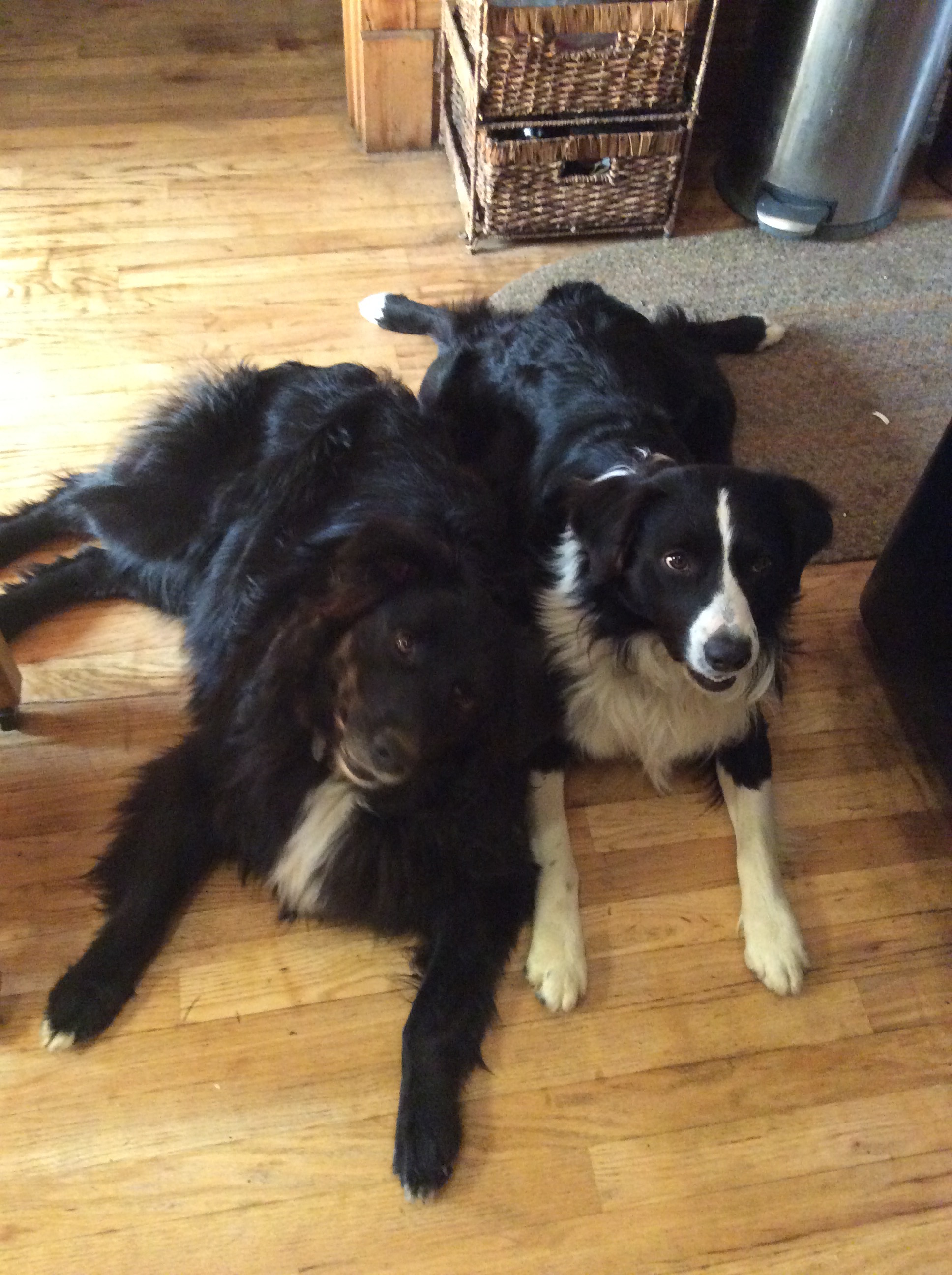 Emma is on the left, Ziggy (Siegfried) is on the right. They’re Australian Shepherds who are supposed to guard the garden, the chickens and the bird feeders, but they mostly troll for table scraps. Shocking.