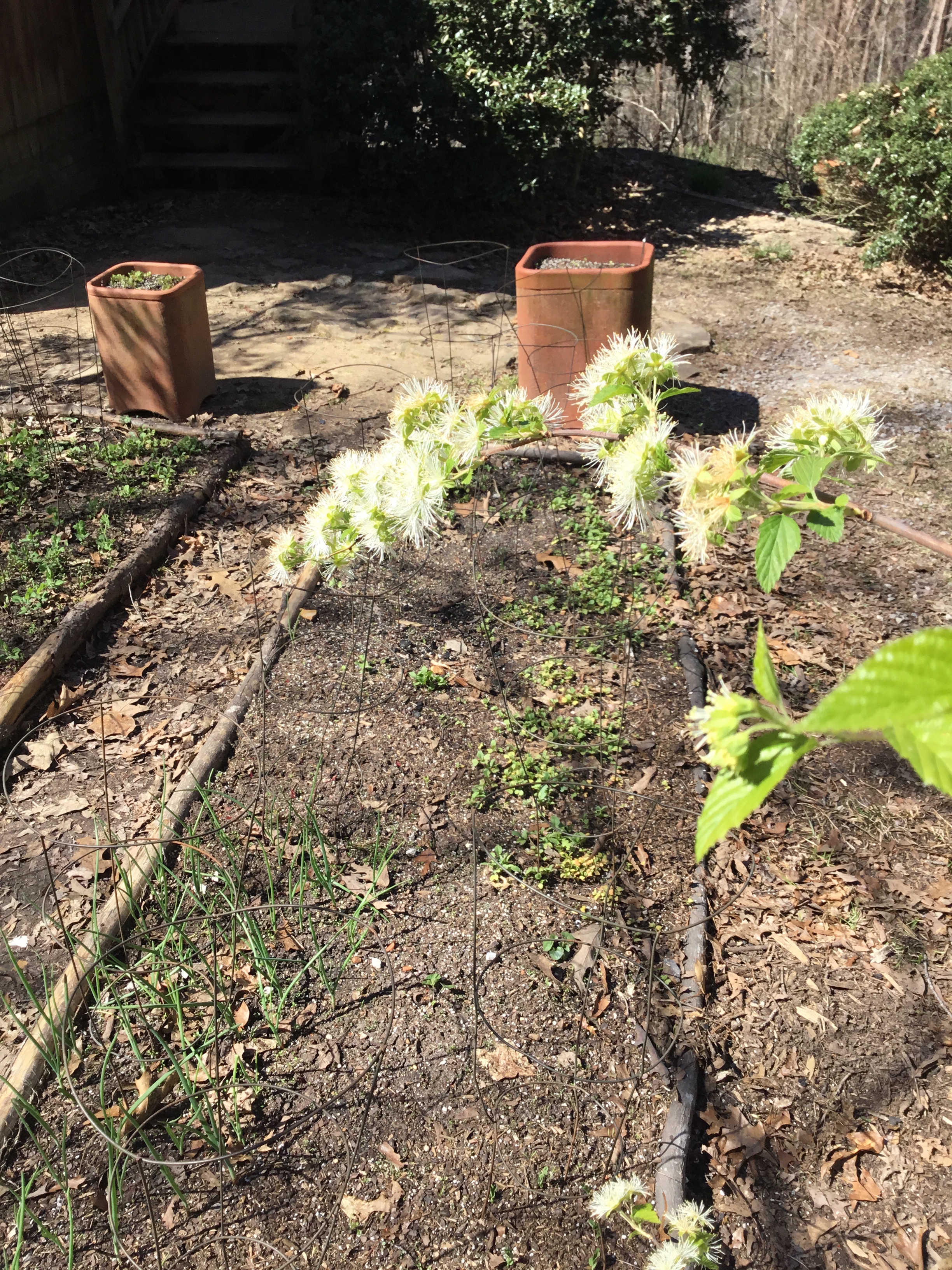 That’s Alabama Snow Wreath, Neviusia alabamensis, standing guard over my scallions, radishes, and peas. It’s an incredibly rare shrub. We’re already eating the scallions, and the mizuna will be next. Then comes the spring favorite: PEAS.
