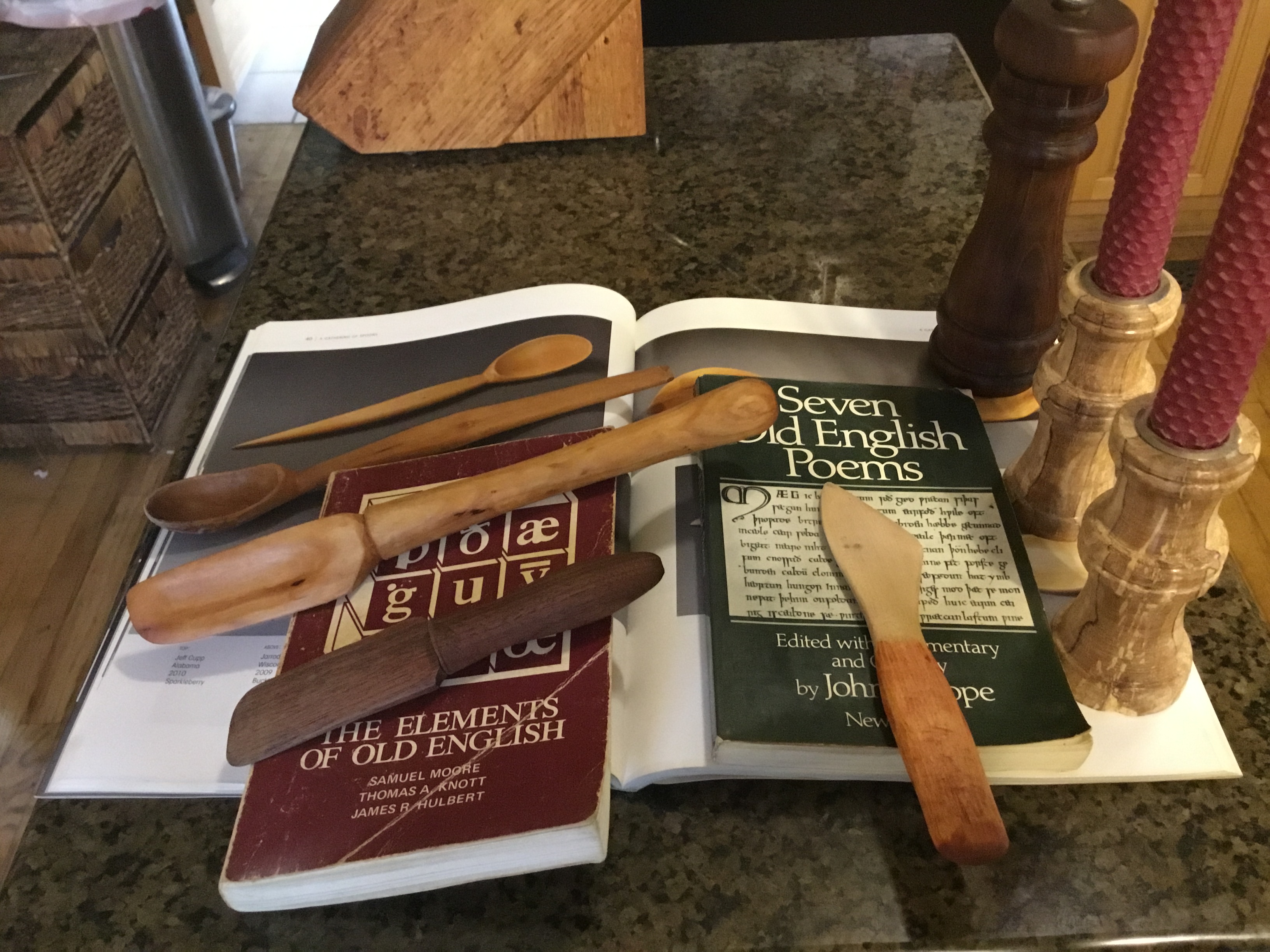 One of my too many hobbies is making treen, using only hand tools and traditional methods. The picture on the top left is a spoon I made that was part of a traveling museum exhibition, chronicled in the book A Gathering of Spoons, compiled and written by the Emeritus University of Connecticut Libraries Director Norman D. Stevens. The rest are all of local woods, including Maple, Dogwood, Black Walnut, and Sparkleberry. I’ll show those individually later, and tell what they all are made for. Cheap metal and cheap plastic are banned from this house, as my wife cringes every time she sees some TV chef scratch up a really nice pan with a crappy imported utensil.