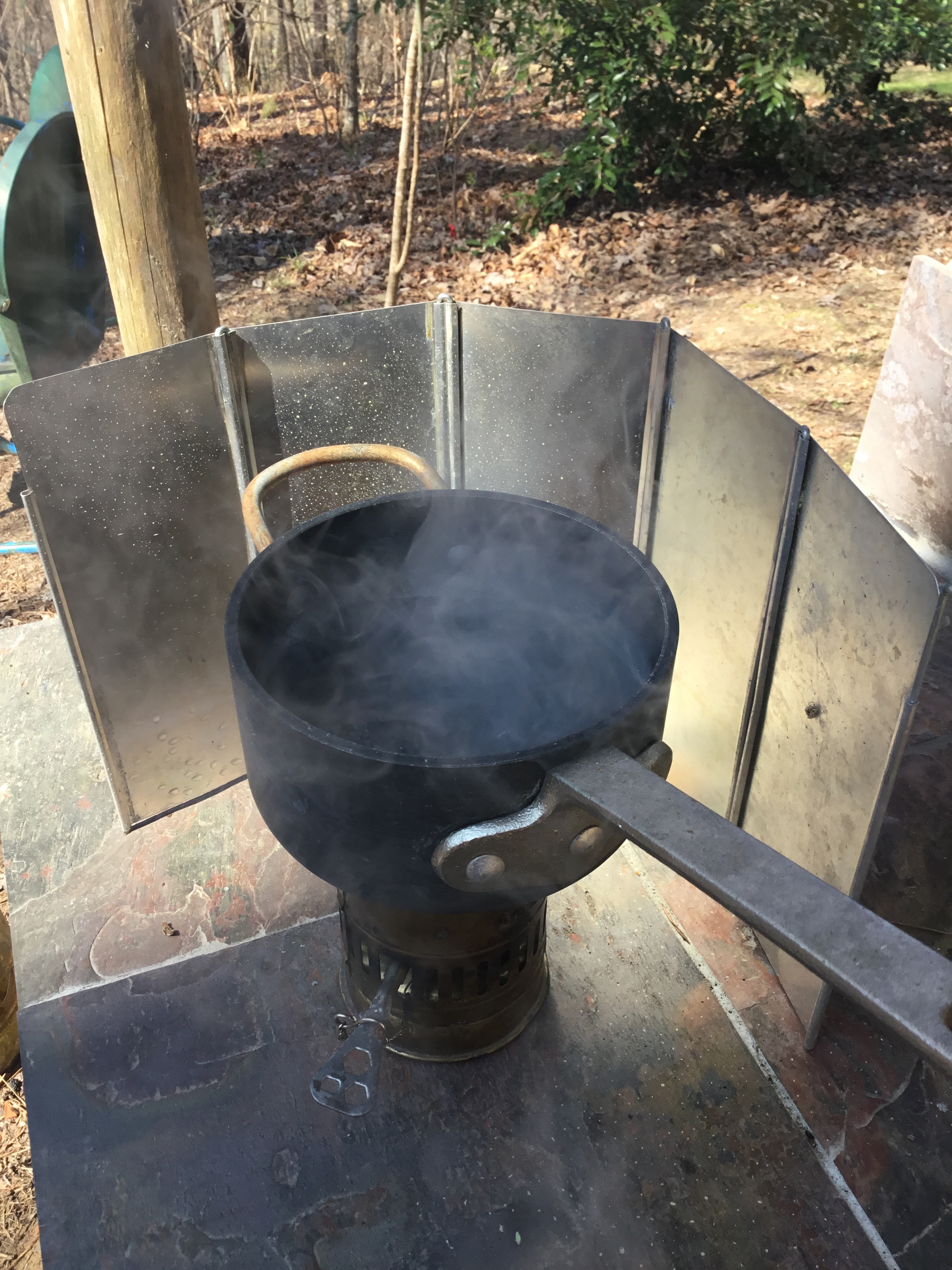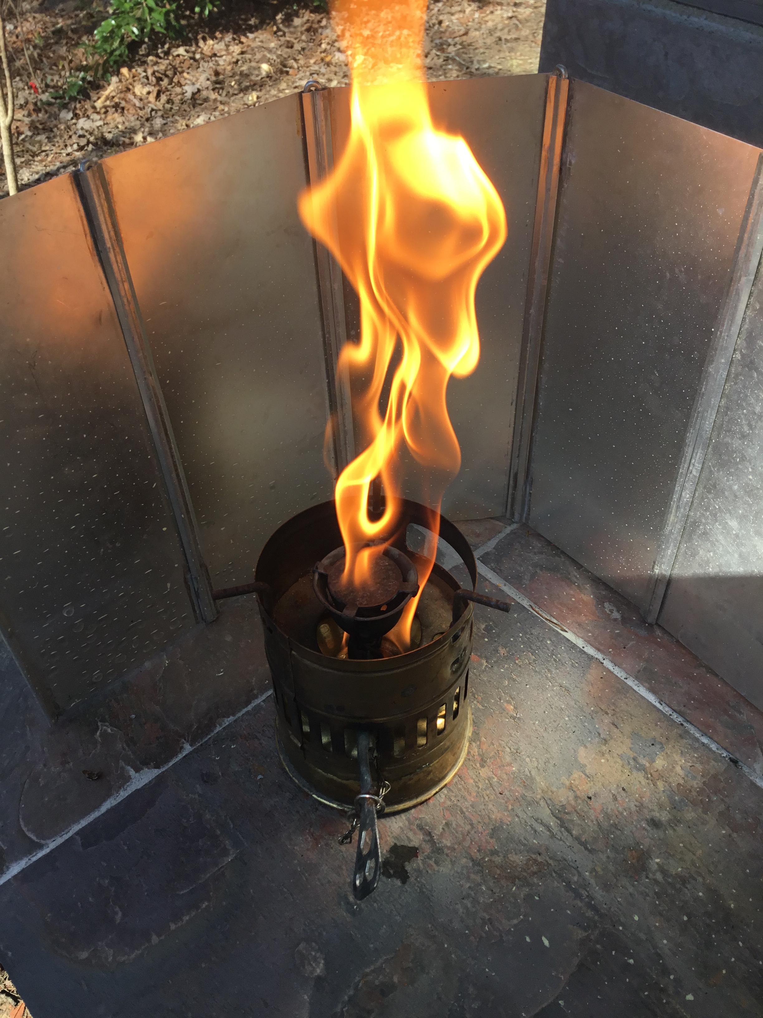 After the starter flame burns out, the stove is easily lit, and then comes the famous sound–a jet engine, or a rocket taking off. Mine sounds like a locomotive trying to get up a mountain-chug chug, chug chug. This is my favorite outdoor stove.
