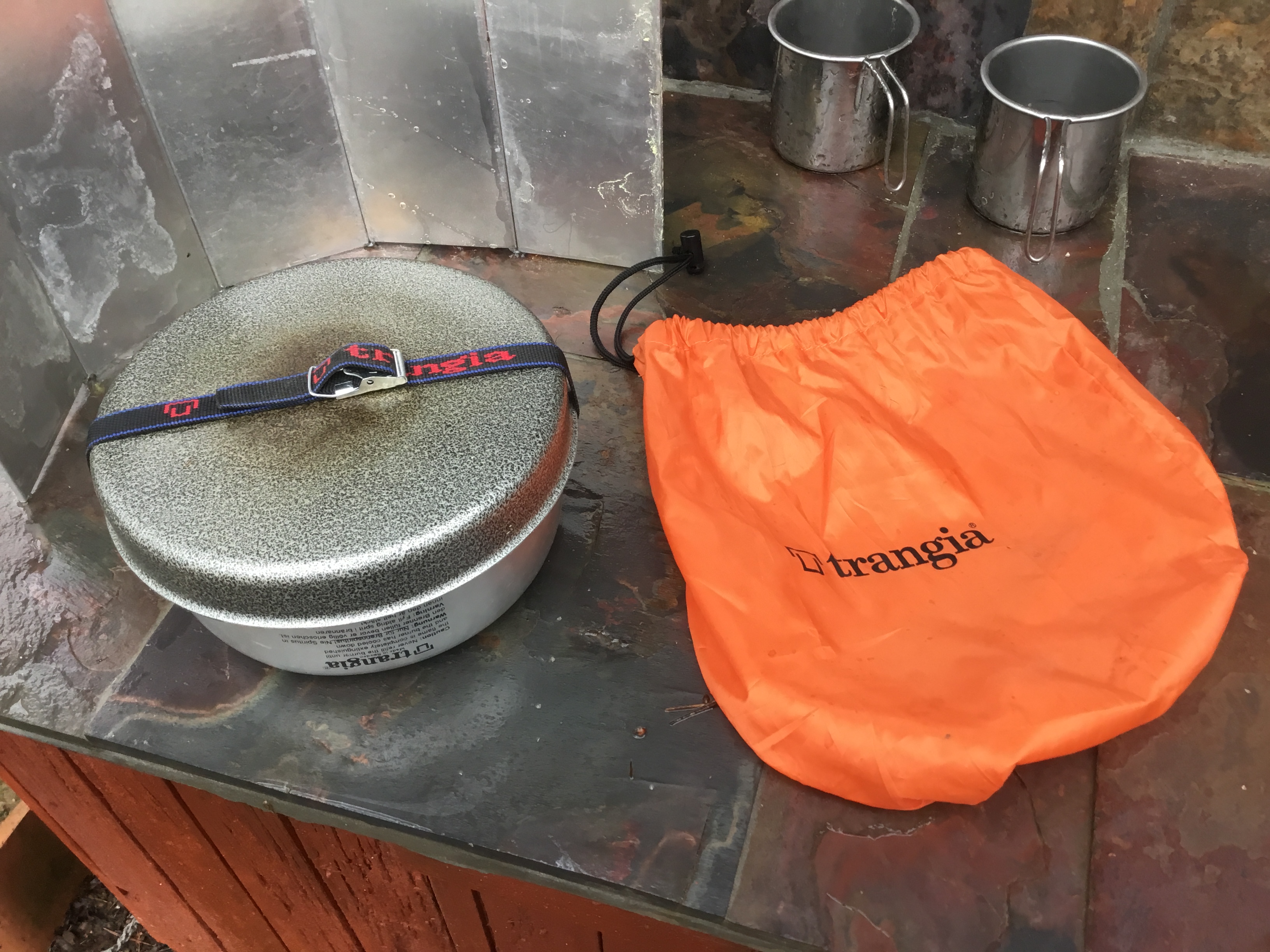 In my never ending quest for sustainable whatever, this one just about takes the prize. The Trangia “spirit” burner, which is the little brass thingy in the middle, will burn anything from denatured alcohol to Everclear. In short the fuel is completely renewable, especially as long as the world is populated by drinkers of bourbon.
