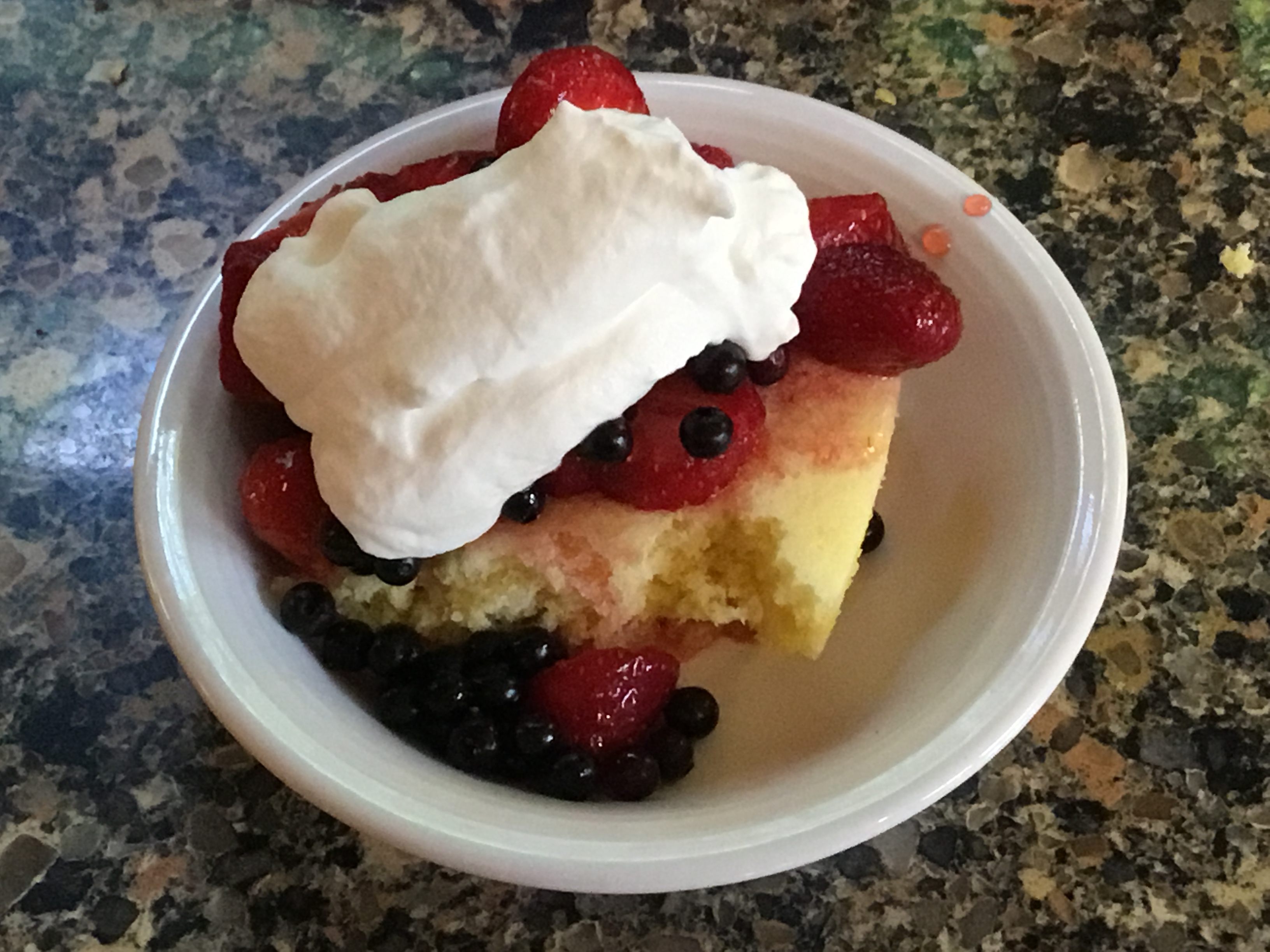 Just cut up the strawberries, and add some sugar. The blueberries don’t need anything but their own fine selves. Whip up some heavy cream and steam a sponge cake.