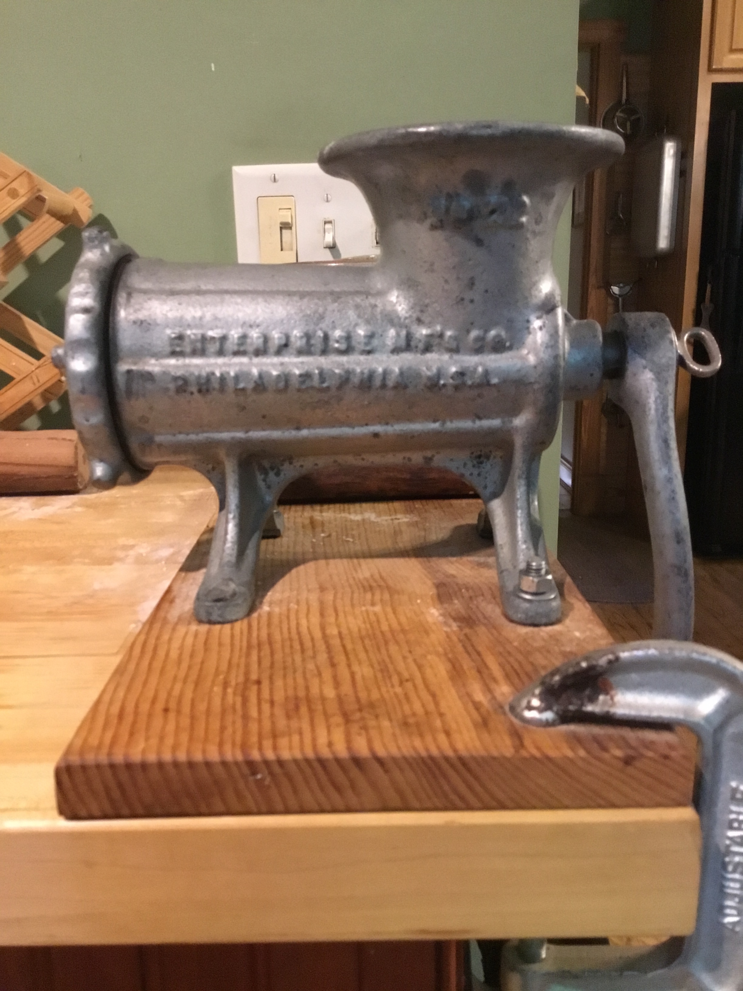 Here’s a vintage grinder plate, a used one, and a new one. The one with the large holes is used with the somewhat deadly looking sausage stuffers, which allows anyone to go crazy making sausage. That’s why I have intestines in my fridge, aka sausage casings.