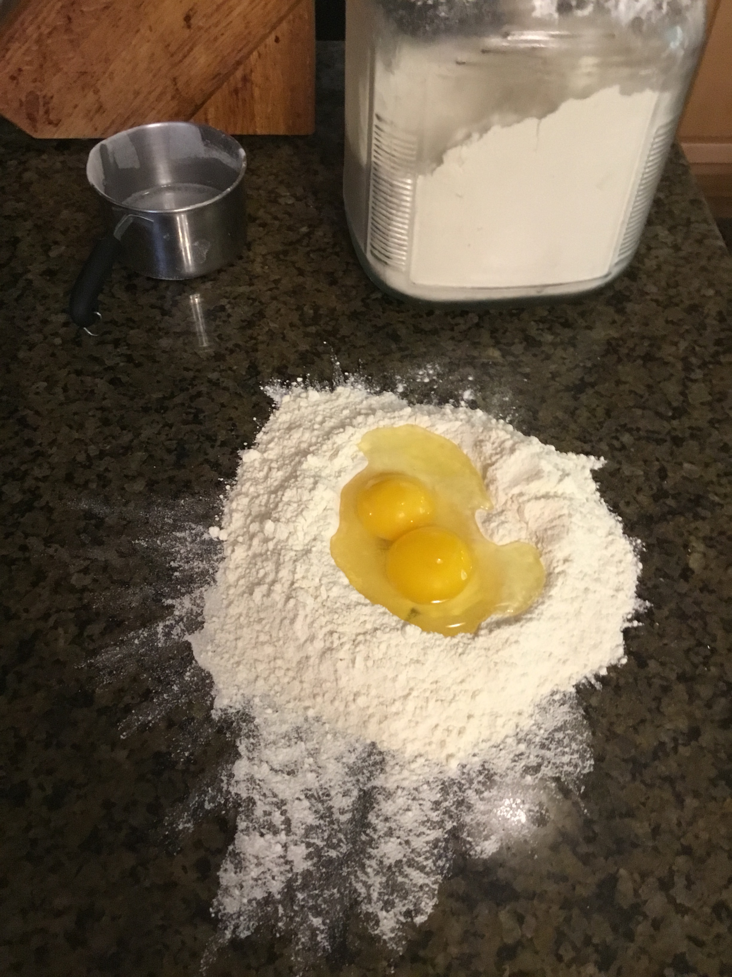 The secret is the ingredients, and there are only two or three. Bill Buford, in his superb book Heat, gave away the secret. He studied in Italy with one of the most traditional and famous pasta makers, and she said it was good eggs, and good flour. In fact she used bootlegged locally grown eggs, which is an EU story that is too complicated to get into here. Here’s the pasta recipe for one big dish of lasagna.