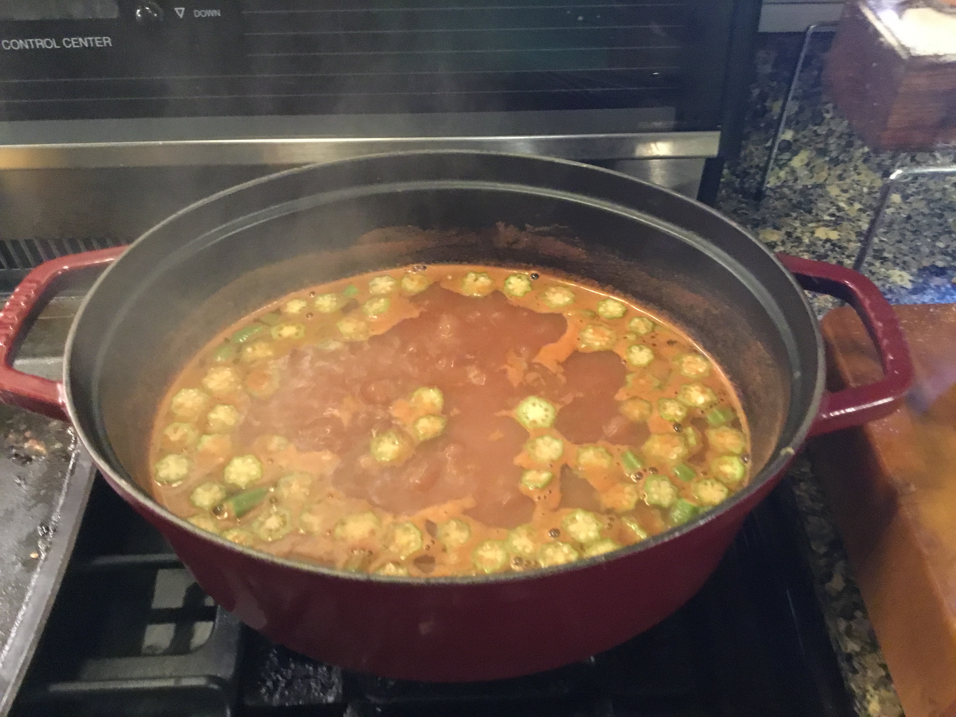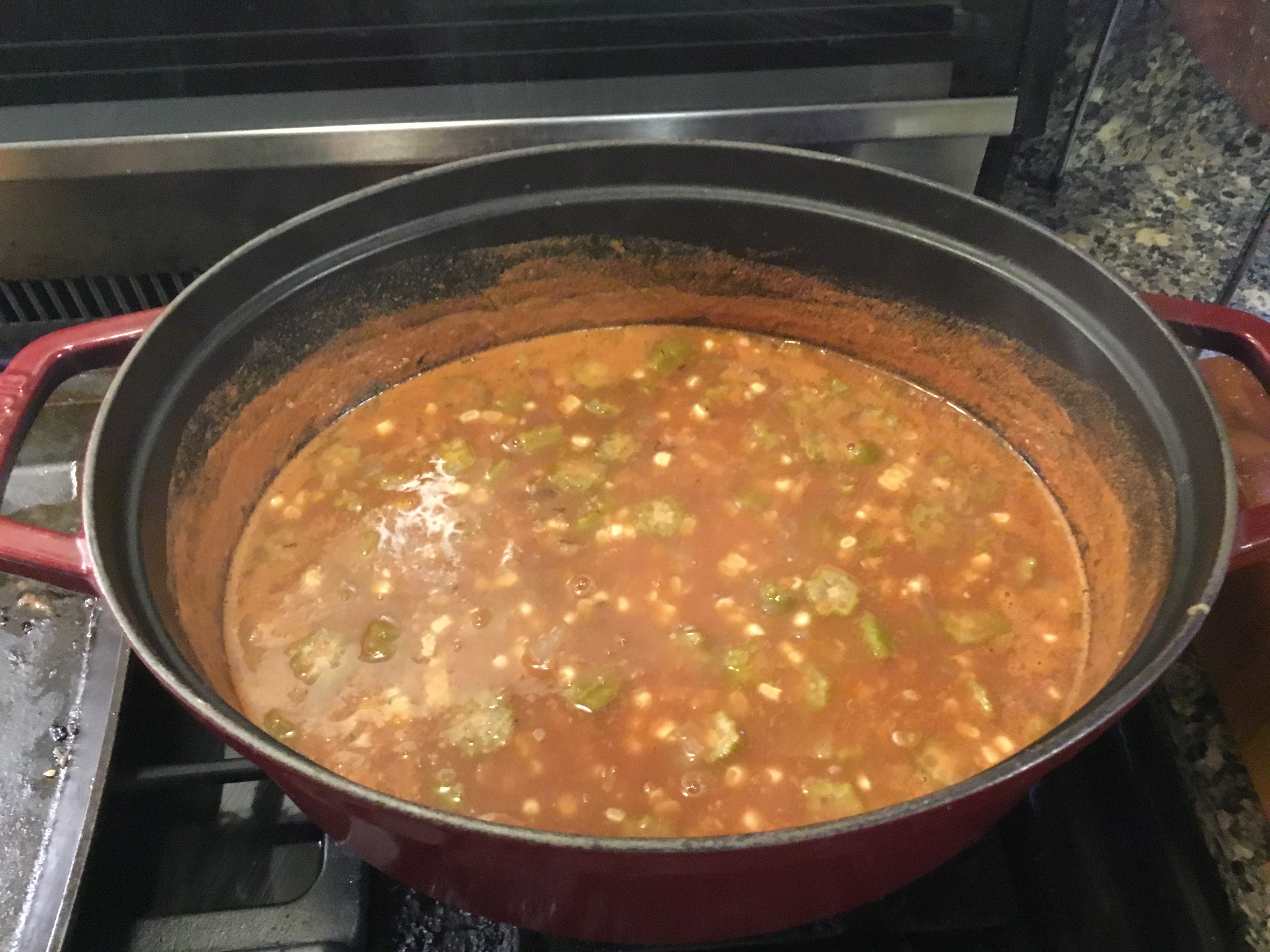 Except for the seasoning, ingredients are cooked in that order. This is truly a dish of high summer, when all these things are in season at once. I now mill my tomatoes in a food mill, so the okra seeds get to be the star. The kicker is when all this is cooked, add: