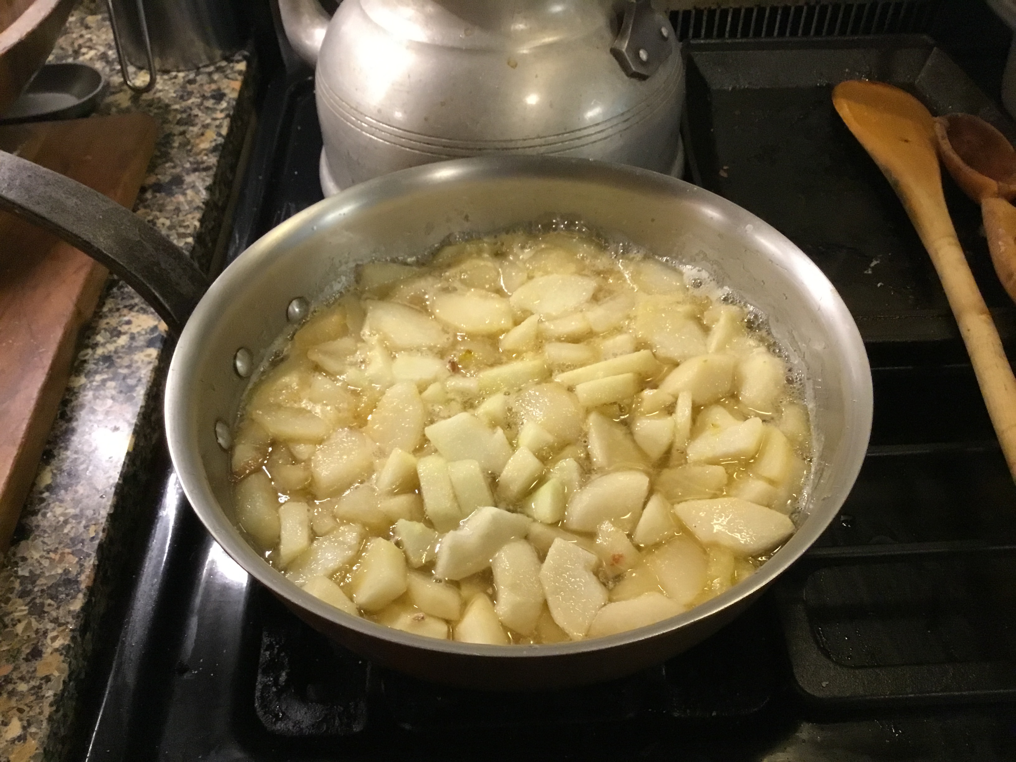 I began with cooking the honey, sliced pears, and the complete interior of the Meyer lemon, minus the seeds. Hint: if you freeze the lemon first, and then cut it in half, the peel comes off all in one piece. Add the sugar, and get ready to go do something else.