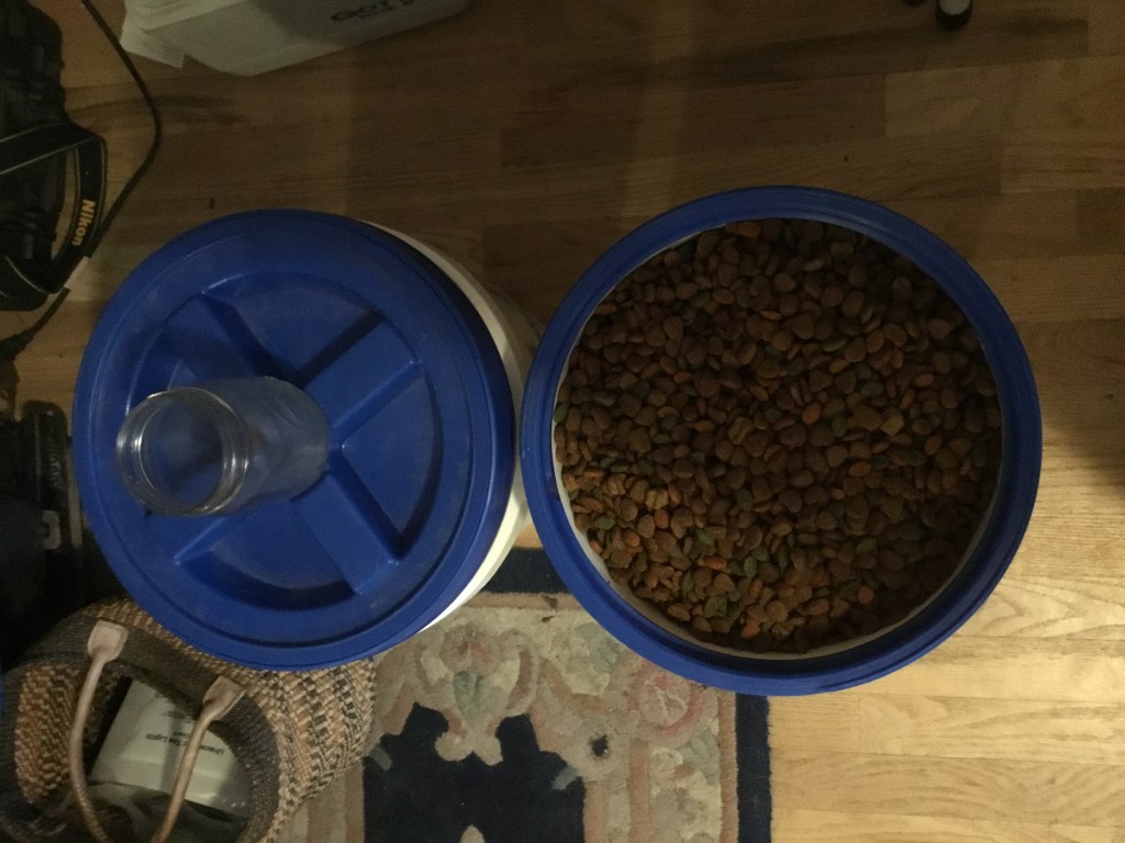 Though in general I hate all plastic products, occasionally one comes along that is actually useful. In this case it is the classic Gamma Seal lid, which turns those disposable and ubiquitous five gallon buckets into something valuable. We have storage now for all the dog food, chicken food, and wild bird seed that we can handle, and I’m talking about fifty pound bags of each, which is what we now purchase, mainly because we have these lids.
