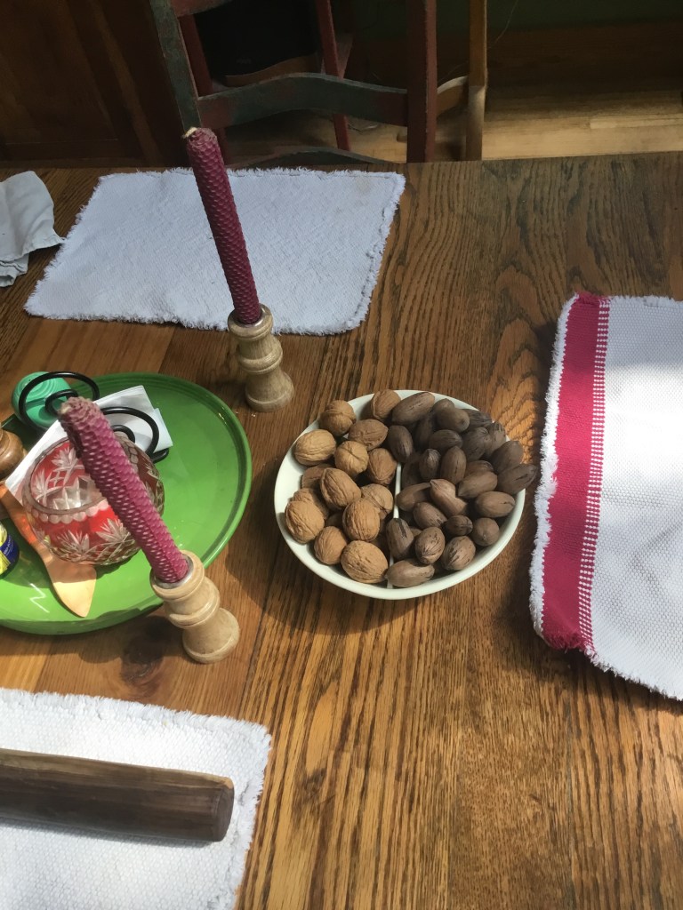 That divided bowl is a beauty. It’s Stanhome Ivy pattern. I made the candlesticks, and the students at Berea College in Kentucky hand wove the placemats. Now it’s time to crack some nuts. Literally.