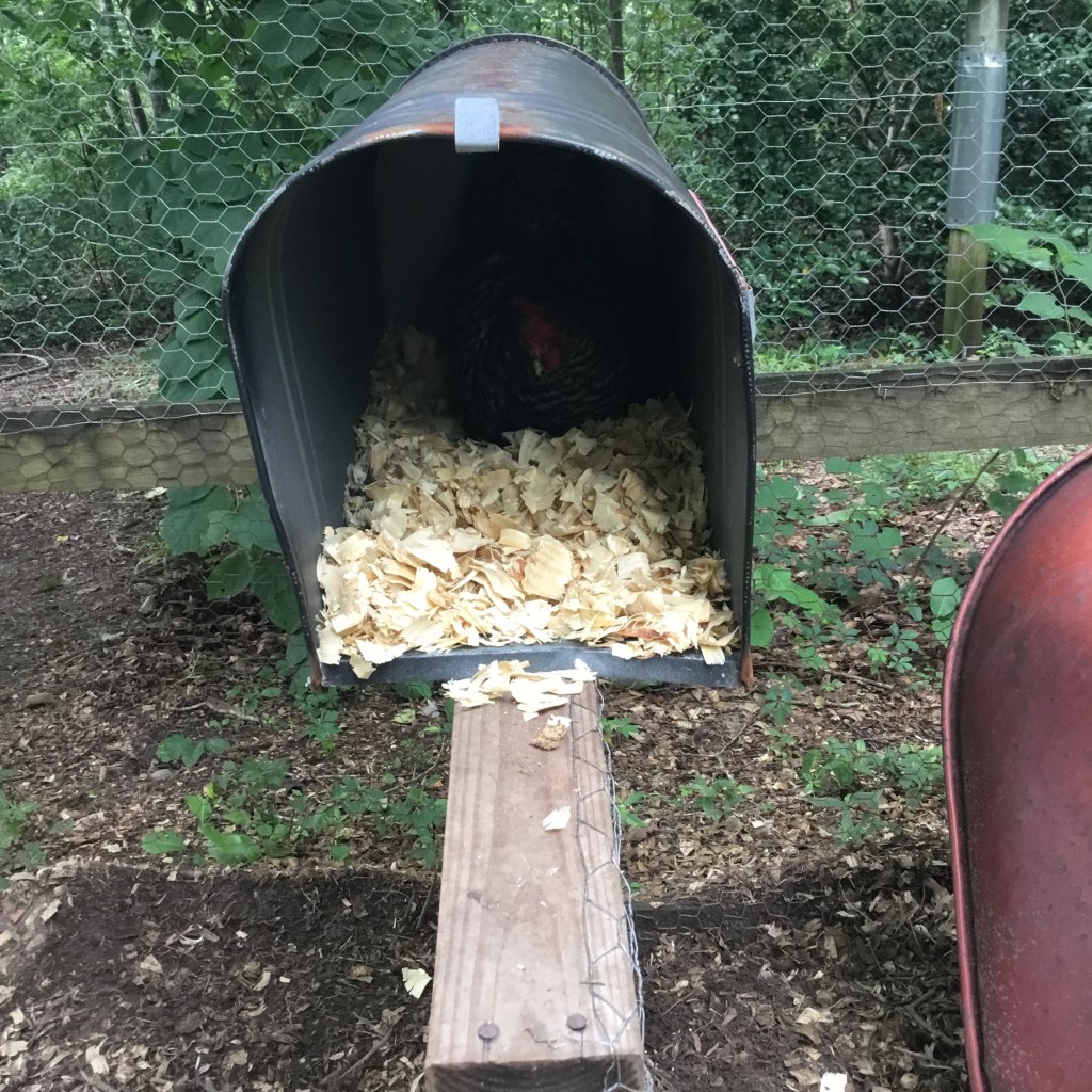 I just added some pine shavings, and five minutes later, the Barred Rock chicken we have named Broody Bird was in there. She got comfy in a hurry.