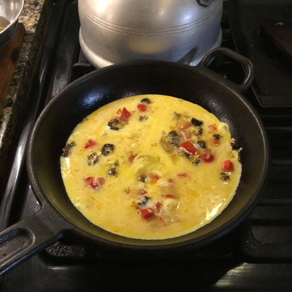 Combine the eggs, cheese, and some of the morel juice, with salt and pepper.. When the veg and fungus is cooked, add the eggs to the mix. Cook on the stove top until the eggs begin to set firmly, sprinkle with chopped parsley, and pop the whole thing into a 400 degree F oven. That’s the entire whang dang doodle.