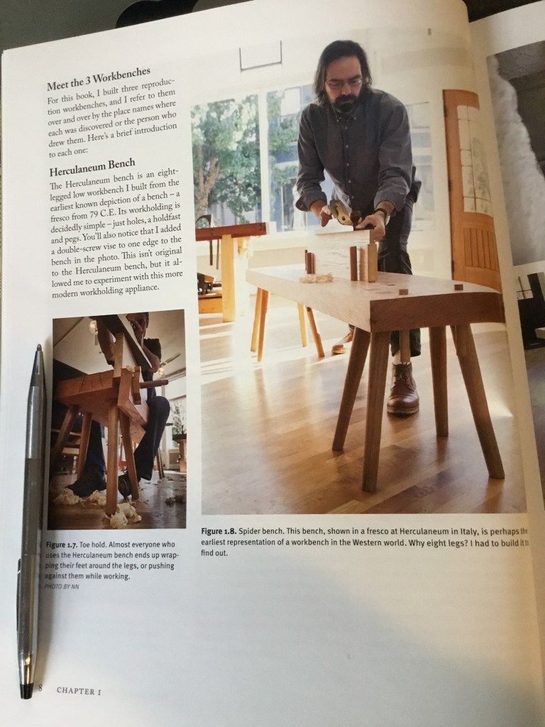 I’m making projects out of this book I got for Christmas like crazy. I’ll write about those later, but I see three more workbenches in my future. Schwartz, and his researcher Suzanne Ellison, go all the way back to Imperial Rome, and the oldest known workbench illustrations. Strangely enough, those benches work as well, or better, than modern ones. This design comes from a fresco from Herculaneum, buried in AD 79 by the explosion of Mt. Vesuvius.