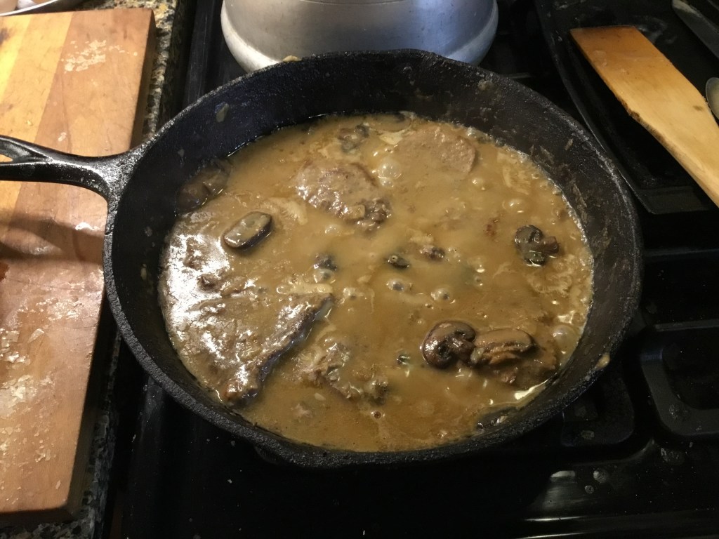 Add the flour, and begin the basis for a brown roux, aka a gravy. Stir regularly, as a roux is also known as “Creole Napalm.” When you get to a brown color to your liking, add the Grillades to the top of the roux, along with the mushrooms. Add the water and stir. Mine looked like this.