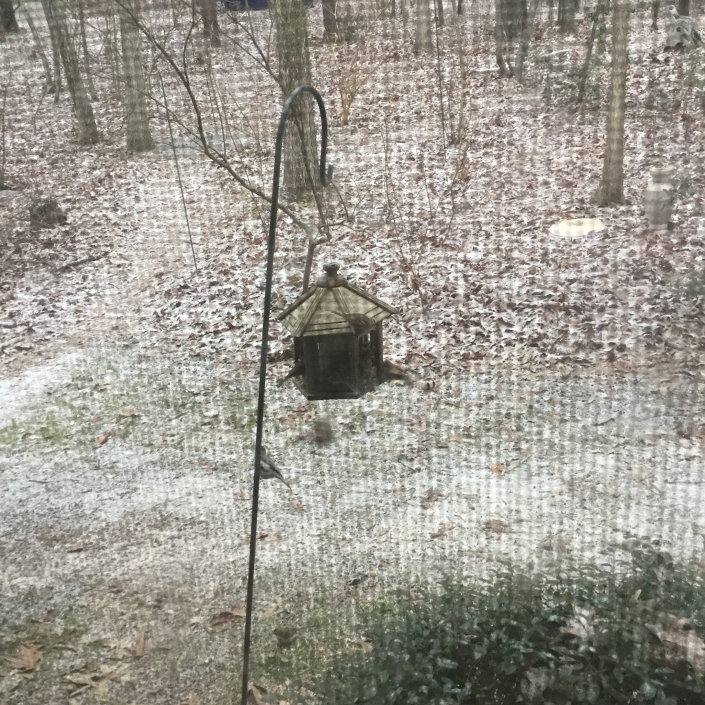 We hardly ever get snow, or temps in the teens, and today we have–BOTH. I saw this coming, so yesterday I bought 110 pounds of bird food. Half was for the wild birds, and half for the chicks. Birds don’t even care about how cold it is, except for how hungry it makes them.