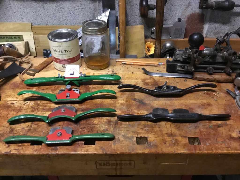 The double cutter spokeshave is the old Stanley Number 60, which has a concave and flat sole. It can be fiddly to adjust, but cuts fine. The top one is my favorite, the flat sole Number 54 Adjustable Mouth Spokeshave. It will cut shavings that are from thick to see through, and I paid a whopping two bucks for it.