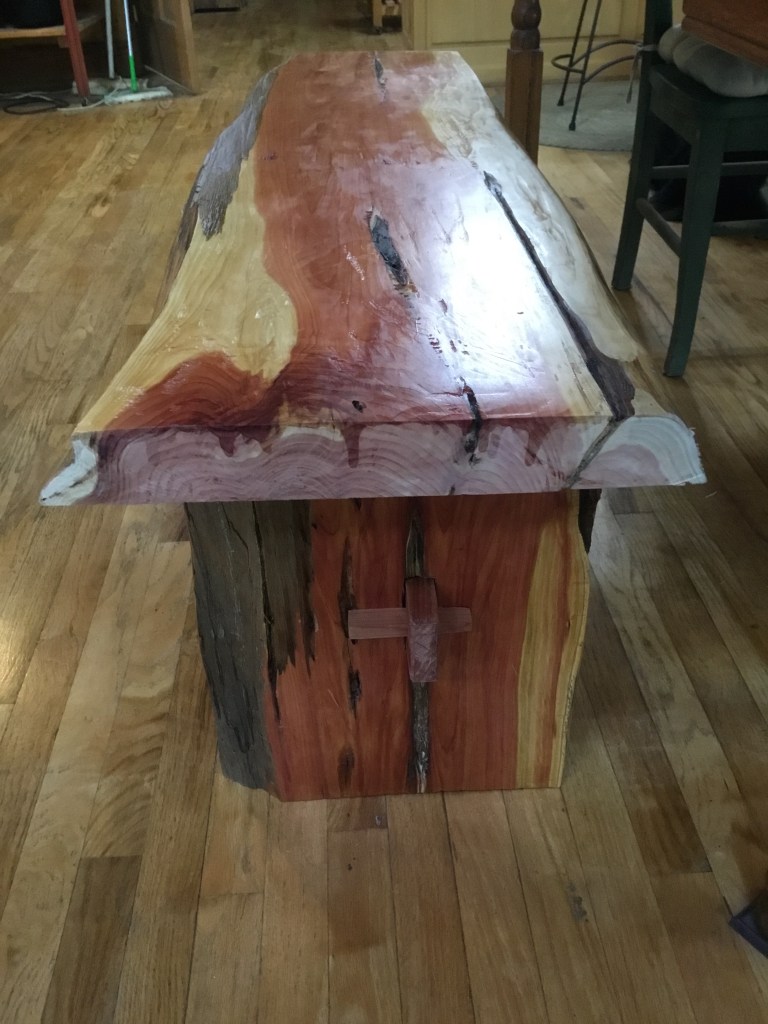I’ve never made something this large from slab lumber, so I made sure it would not fall apart–the stretcher is through tenoned and held together with a tusk wedge.