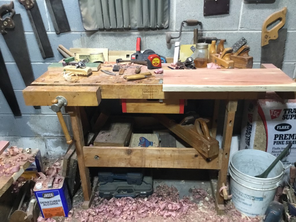Sjobergs of Sweden makes literally thousands of benches and go alongs every year. This one is headed for its forth decade soon, and still has many years left in it. Professional woodworkers prefer mortise and tenoned benches the size of a Buick or a beached whale, but this has had at least four different homes, and it was easily moved. Was–it is now bolted to concrete in four places by lag bolts.