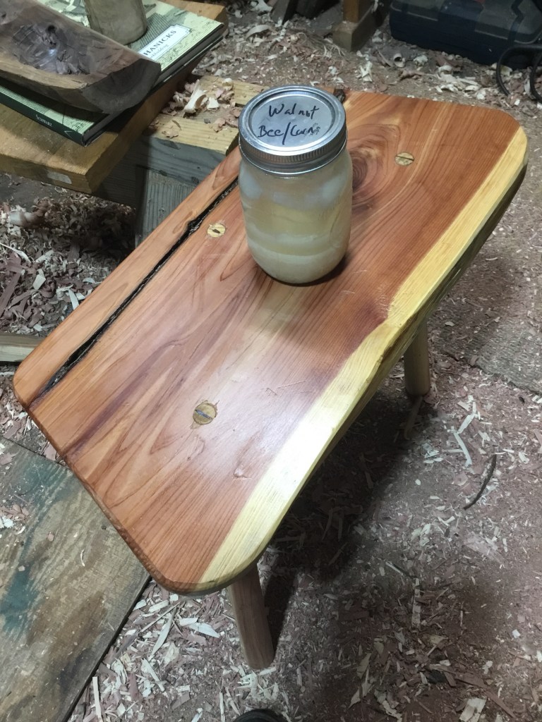 My three legged Cedar stool had only a finish of cheap Linseed oil, and this wax finish brought it back to life. The next project is finishing my low workbench #3, which is a full 6′ 7″ long. I may need to cook some more finish for that.