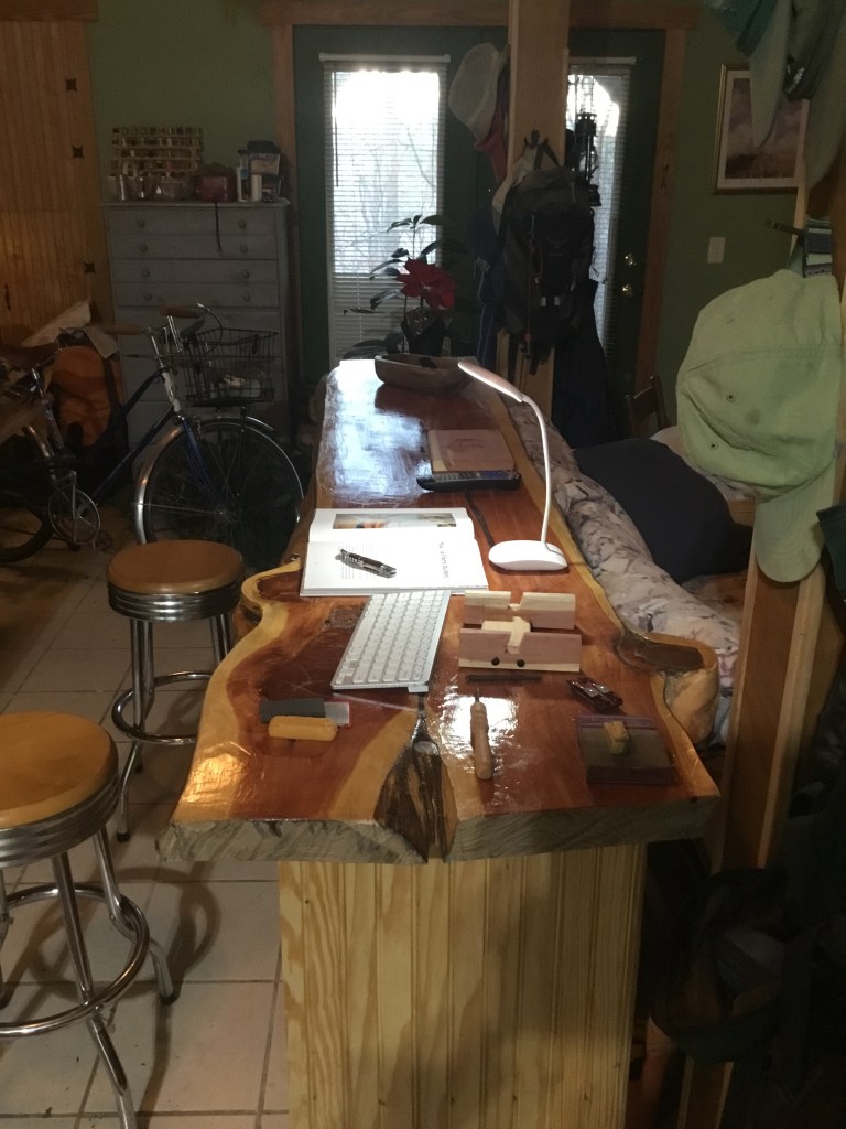 This 8 1/2′ long piece of Eastern Red Cedar was meant to be a workbench, but turned out looking a lot like a bar–hence our name for it is “work bar.” I’ll put it to work tonight cheering on the Crimson Tide, and cursing the despised SEC refs. They would call a ten yard penalty on their own mothers for holding a baby.