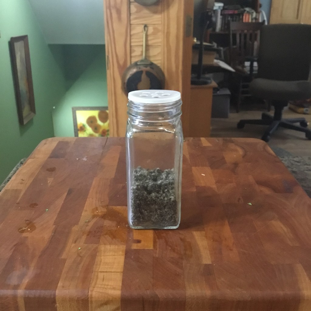 Rubbing is simple. Add a handful of leaves into the palm of your non-dominant hand, and commence rubbing the dried leaves between two fingers of your dominant hand. Collect them in your palm, and funnel them into a spice jar. This amount of leaves made one third of a standard spice jar, as pictured.