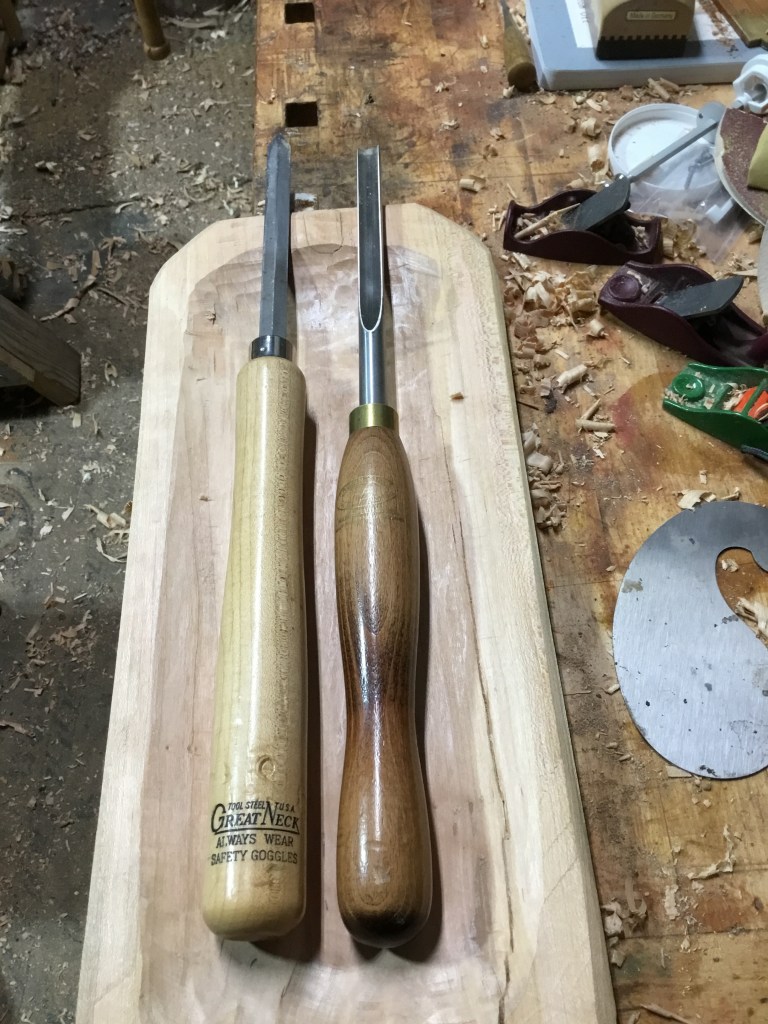 The roughing tools below are specialty tools made specifically for foot powered lathes. The 2″ chisel and the 1 1/2″ shallow gouge can be used in any combination, though I go gouge, and then chisel. These make fast work creating a perfectly round blank.