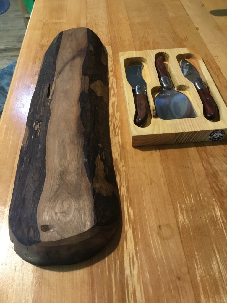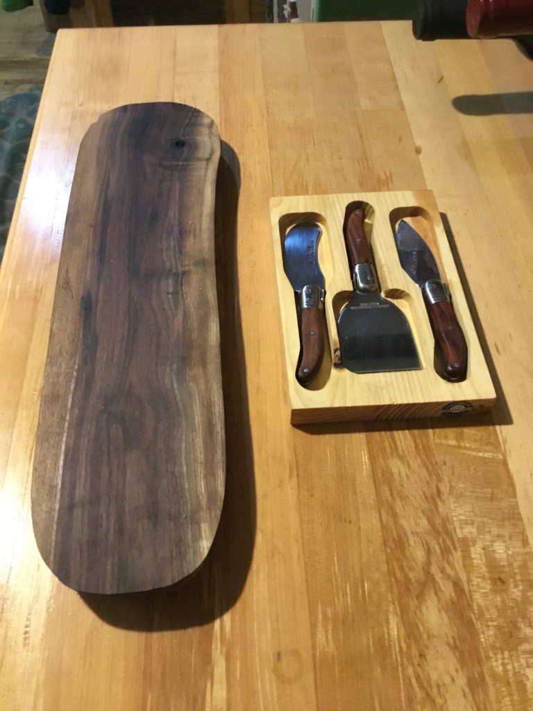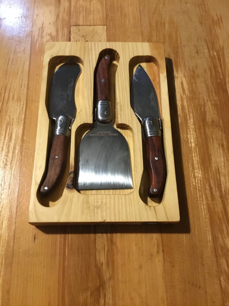 This Laguiole cheese set was bought from Fleabay for the price of a six pack. Some rubbing compound on the stainless, some sandpaper and walnut oil on the handles, and they look better than the ones that come out of the factory. From the grainy picture on the interwebs I thought they were walnut handles–after finishing them, I think they are rosewood instead.