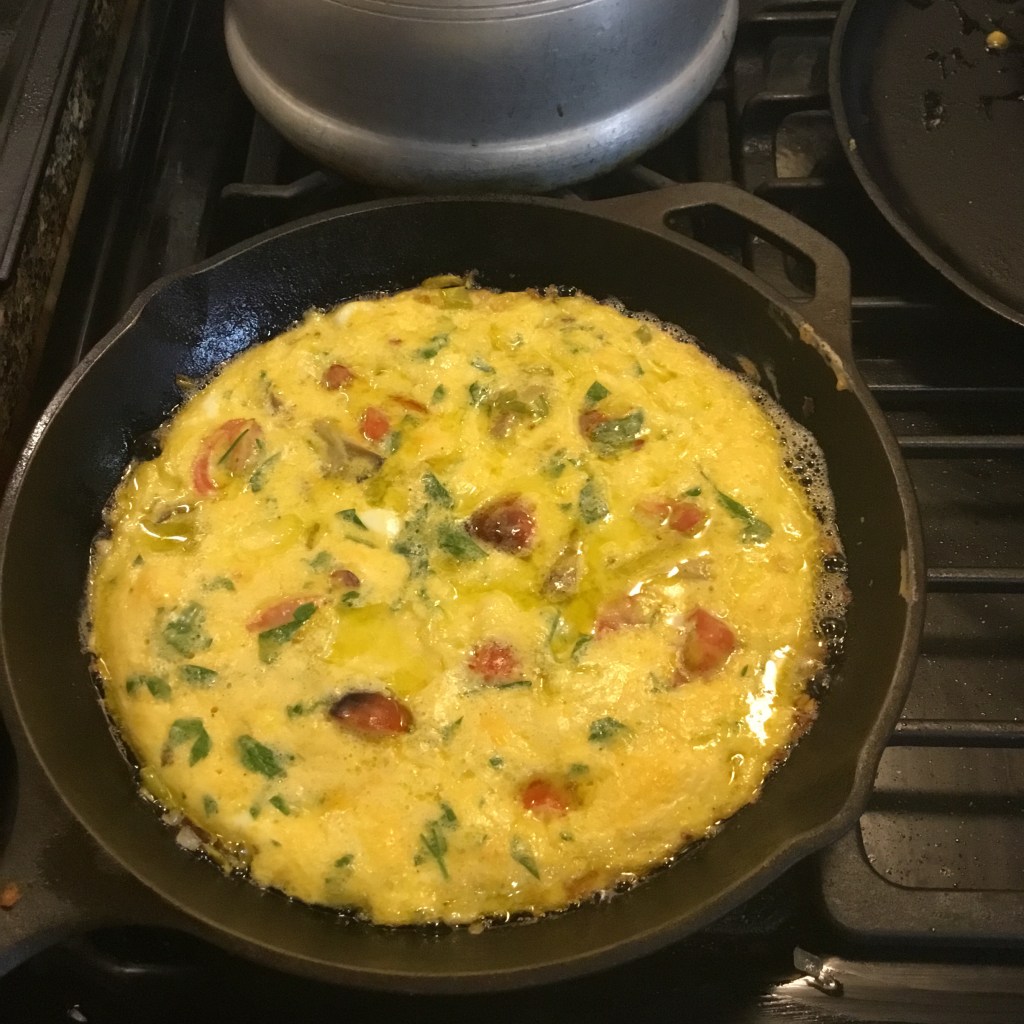 Pour the egg mixture into the veg, and cook this frittata style–let the eggs begin to set, and then throw the skillet into a 400 degree F oven, until the omelette is done to your liking. Alas, poor supermarket. Only two imported items, from Italy and Vermont. Wait, the cast iron skillet is from Tennessee, another exotic foreign country.