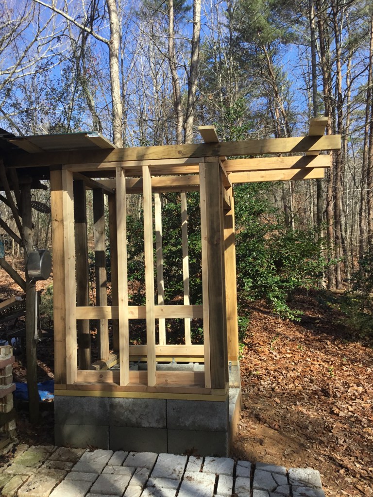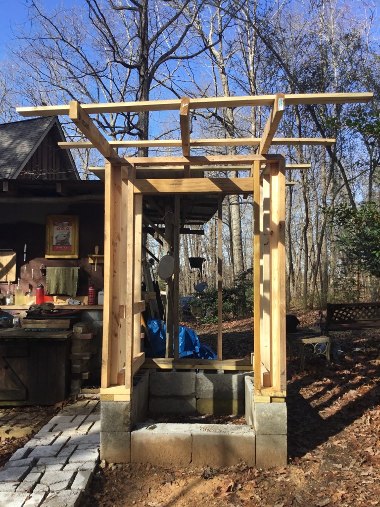 Not long thereafter BIL #2 got in on the action, giving us the lumber for the front and back walls, as well as the rafters, and some tin roofing. He really really wants this thing to be finished, as he has a whole list of meat smoking projects. We (gasp) actually bought the lumber for the two side walls. I have plans for a fancy door as well.