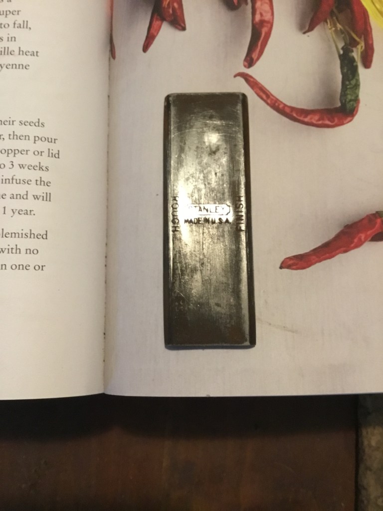 As there isn’t much detailed info about these available, I was intrigued by the original scraper blade, which has two edges bent at ninety degree angles. A couple of swipes with sandpaper revealed the Stanley logo. No big surprise there.