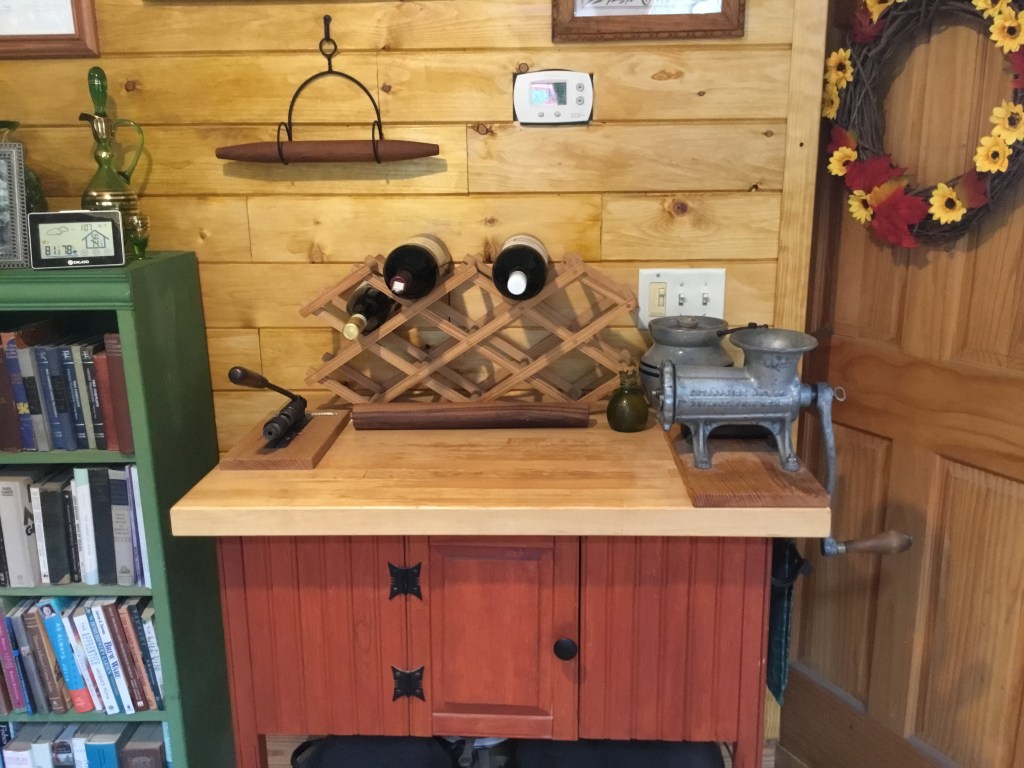 An antique but portable item, this old pecan cracker that belonged to MJ’s grandparents has a definite 1900 industrial look. The only thing it won’t crack are hickory nuts, but I have a 23 ounce framing hammer for those. Not too many people have a Pecan cracker in their living room, but sometimes nuts need to be cracked.